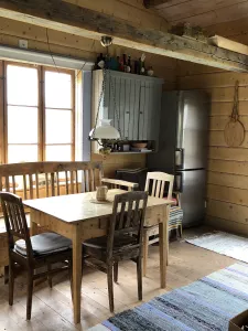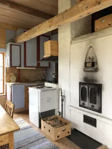 - Köket har el-spis med ugn (ingen micro), vedspis, kyl och frys, vattenkokare, kallvatten och avlopp.