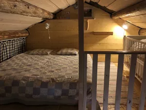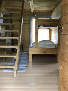 - En våningssäng nere och sovloft med 2 sängar utrustade med täcken och kuddar. Barnsäng kan ordnas.